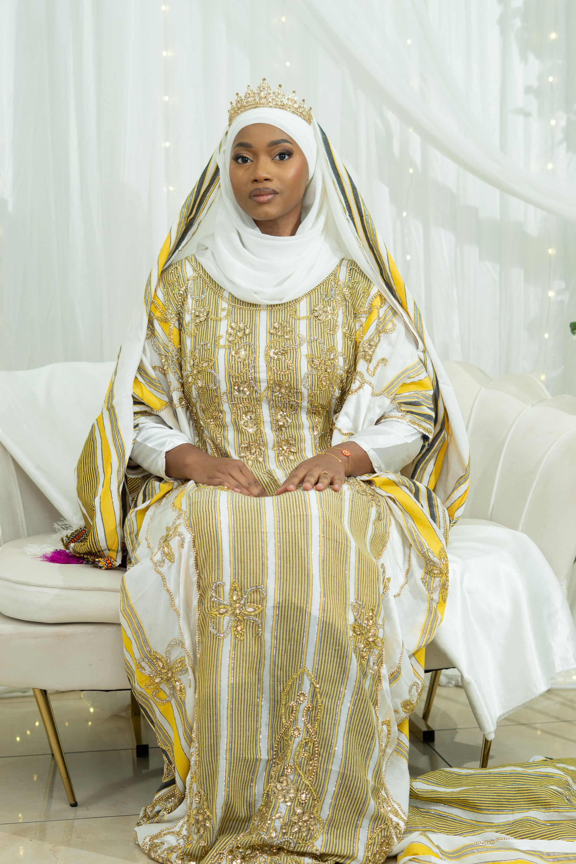Une robe qui allie avec éclat noblesse et modernité. Sublimée de perles dorées, elle illuminera votre allure le jour J tout en préservant votre pudeur avec une élégance naturelle. Majestueuse, elle offre un équilibre parfait entre satin soyeux et tissu traditionnel, rehaussée d’une traîne somptueuse délicatement ornée de perles.